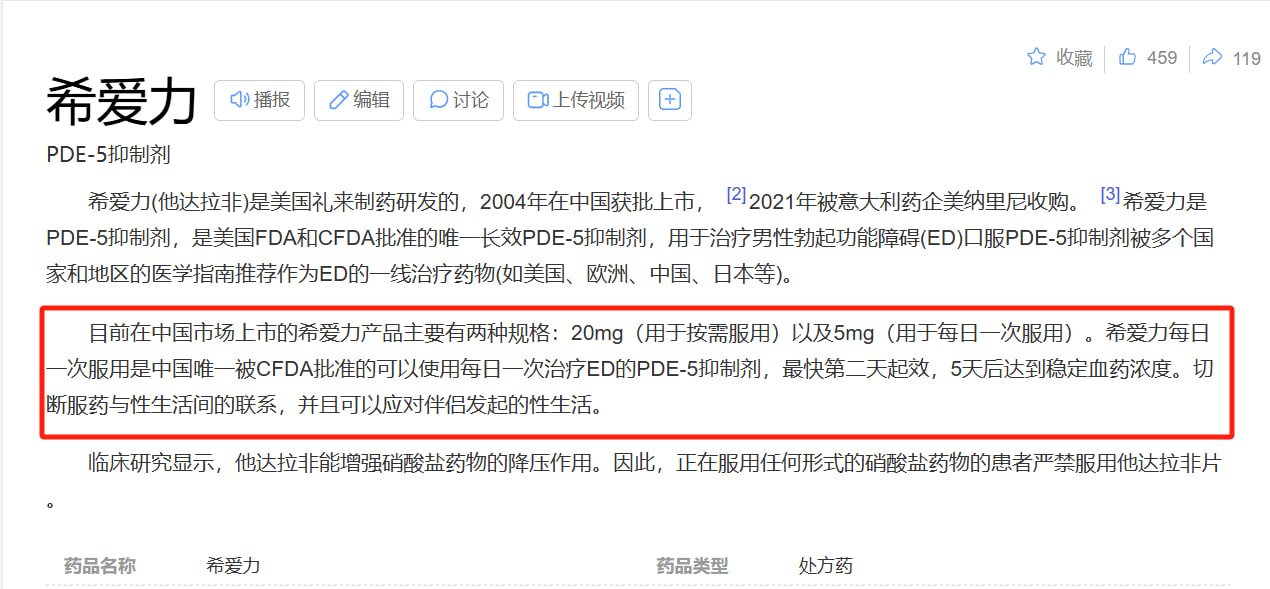 希爱力5mg(每晚睡前服用,每日一次),需要持续吃3-6个月,唯一被CFDA批准的可以使用每日一次治疗ED的PDE-5抑制剂,2-6小时达到稳定血药浓度,并且可以应对伴侣发起的性生活。
